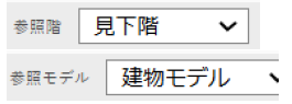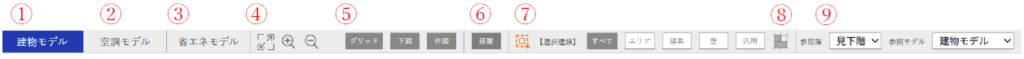 | ⑨ | 参照階・ 参照モデル | 各種選択種類の中から、作図の下に表示する階を選択します。 【選択種類】 1.参照階 ・なし…階を表示しません。 ・見上階…作図中の階の1つ上階を表示します。 ・見下階…作図中の階の1つ下階を表示します。 ・1F…1Fを表示します。 ・2F…2Fを表示します。 ・3F…3Fを表示します。 ※ 上記の1F・2F・3Fは例であり作成した階の名称に準じます。 2.参照モデル ・建物モデル…参照階で設定された階の建物モデルを表示します。 ・空調モデル…参照階で設定された階の空調モデルを表示します。 ・省エネモデル…参照階で設定された階の省エネモデルを表示します。 |