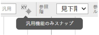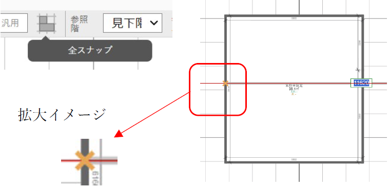 | ⑧ | スナップ機能 | 頂点や線、汎用作図へのスナップ(吸着)機能です。 ボタンをクリックすることで、作図中でも3パターン切り替えが可能です。キーボードの「S」押下でも同様の操作が可能です。 ・全スナップ…全ての頂点と線をスナップします。 作図入力中に部屋や屋根の辺と重なる箇所に交点マークが表示されます。 ![]() ・汎用作図のみスナップ…汎用作図のみスナップします。 ![]() ・全スナップなし…全てにスナップしません。 作図入力中に部屋や屋根の辺と重なる箇所には交点マークは表示されません。 ![]() |