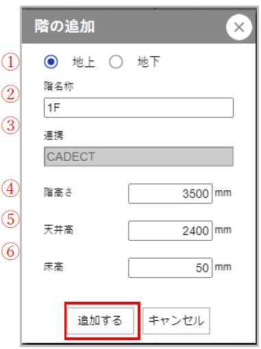 | ③ | 連携 | CADECTで階を追加するので、連携には「CADECT」がデフォルト設定されています。 |