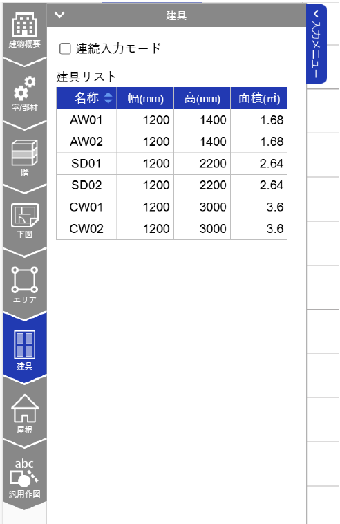 建具の設定を行い、エリアメニューに適用される情報を設定します。