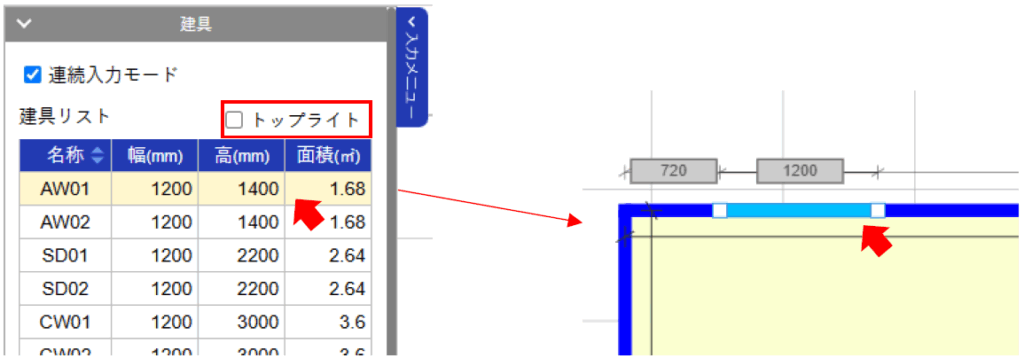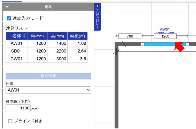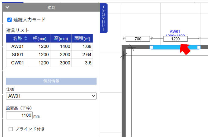 建具リスト(画像では窓(AW01))をクリックし、エリアの外線にクリックで配置します。