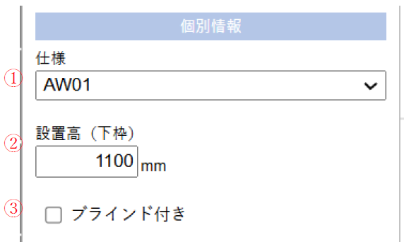 | ② | 設置高(下枠) | 設置する高さ。 建具の下枠が階高からどの高さにいるかを入力します。 建具(CW以外)が上の階高さを越えるような配置をした場合、アラートが表示されます。 その場合は建具の高さや設置高を見直してください。 ![]() |