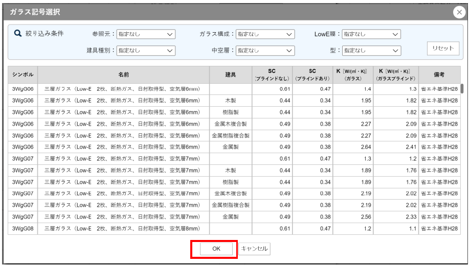 ガラス記号テーブルの行を選択して、「OK」ボタンをクリックします。