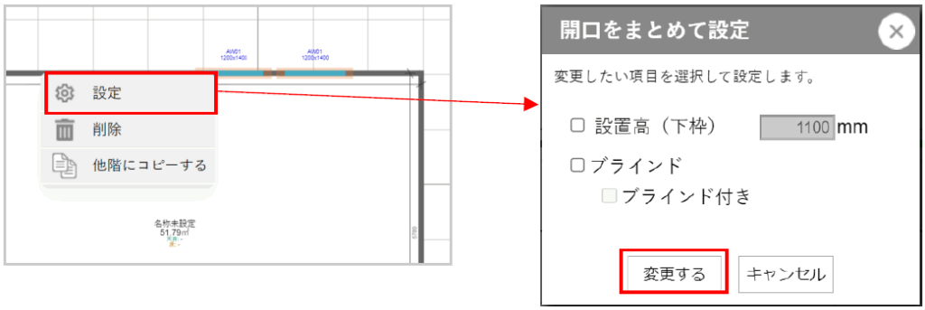 変更したい項目にチェックを入れて、設置高(下枠)、ブラインド付きかどうかを設定します。