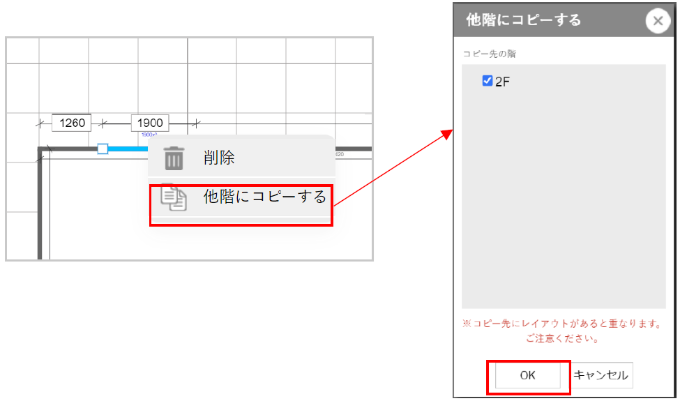 コピーする階をクリックし、「OK」ボタンをクリックします。