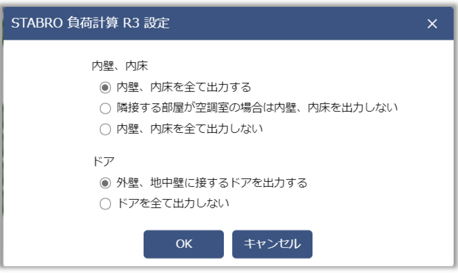内壁、内床・・・熱負荷計算の際、隣接する空調室の構造体情報を計算対象とするかを選択します。