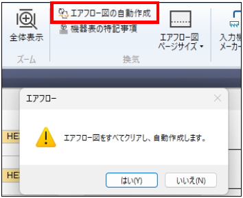 既にシートが存在する状態の場合、「エアフロー図をすべてクリアし、自動作成します。」の確認メッセージを表示し、「はい」を選択した場合のみ、自動生成し直します。