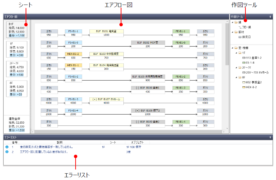 全てのシート上の給気量合計と、排気量合計の差分を以下の通り表示します。