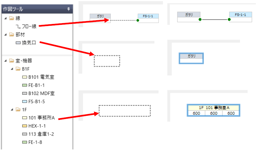 作図ツールに、フロー線、換気機器の各ノード、室ノード(諸元入力にて登録した室)が一覧表示されます。