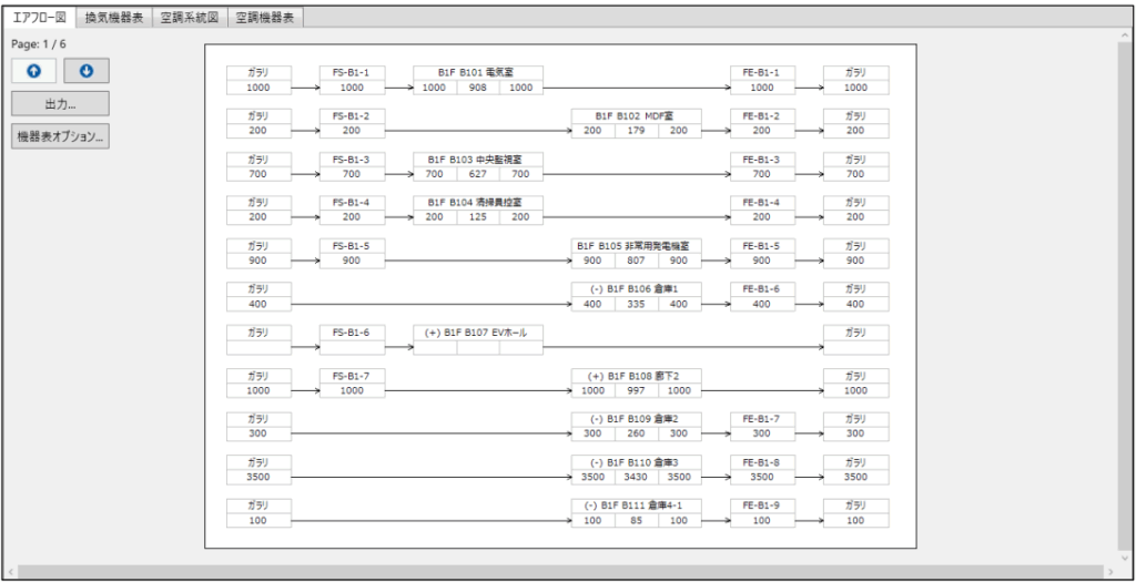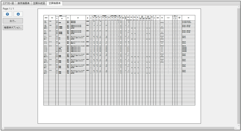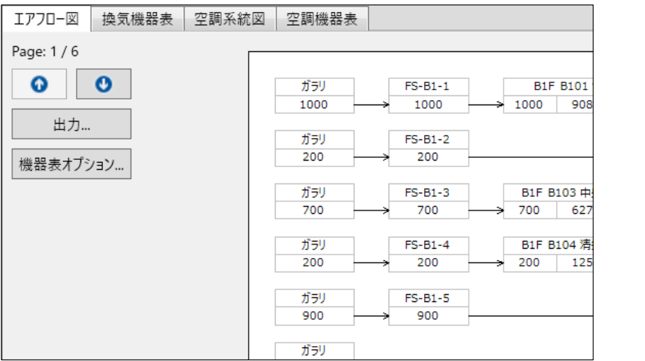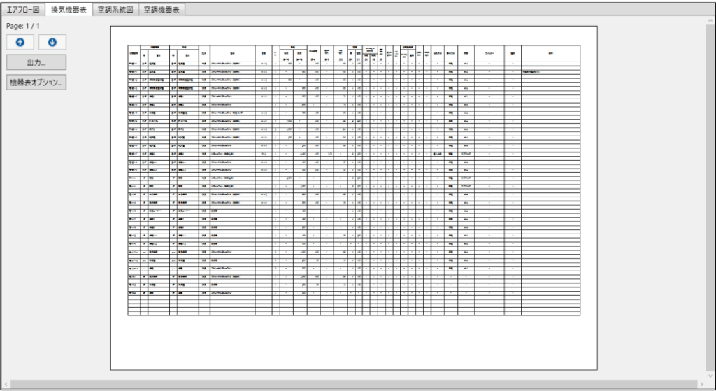 エアフロー図、換気機器表、空調系統図、空調機器表の出力プレビューを確認するには、ナビゲーションバーの[CAD出力プレビュー]をクリックし出力プレビューしたい帳票タブを選択します。