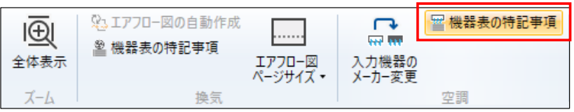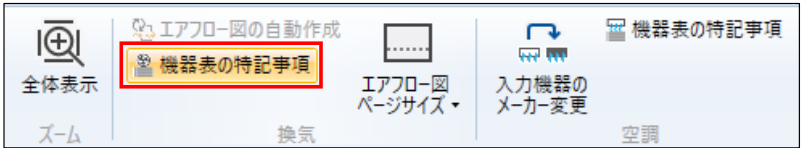 ・空調機器表の特記事項を設定するには、[ホームメニュー]-[空調]-[機器表の特記事項]ボタンをクリックします。