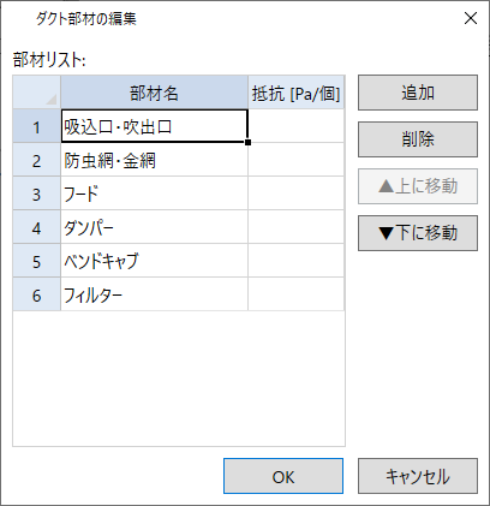 部材の種類と抵抗値を登録・削除など編集する「ダクトの部材編集」画面を表示します。