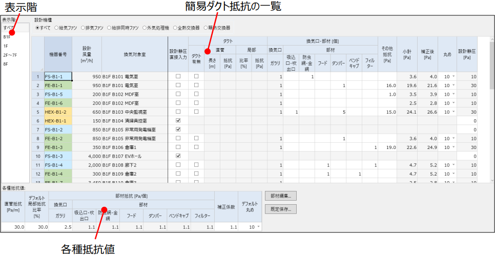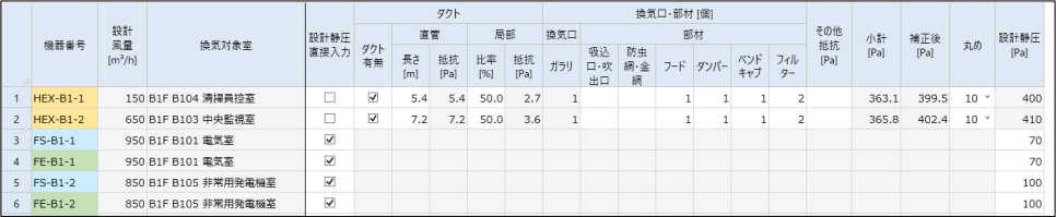 換気機器設計画面で追加した換気機器に対して、簡易的な計算で設計静圧を求めます。