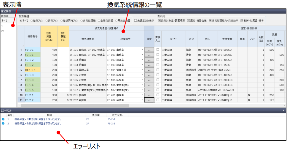 換気機器設計画面で追加した換気系統情報の一覧が表示されます。