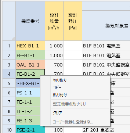 貼り付け対象の行を選択した場合のみ選定機器の貼り付けを行うことができます。