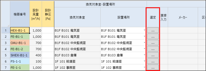 この画面では追加した機器に対して、換気機器の選定を行います。