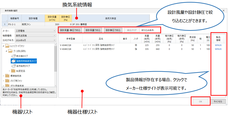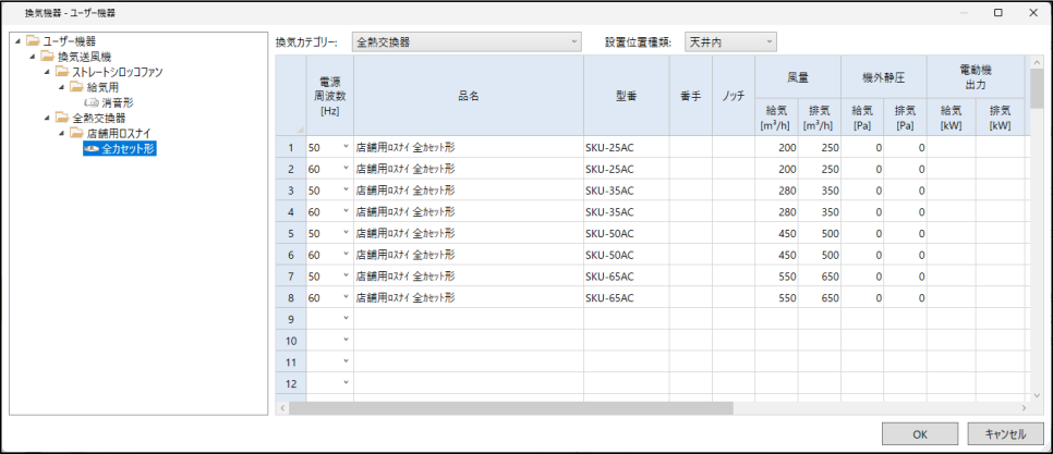 ③[OK]ボタンを押すと、換気系統情報に選定した機器が登録されます。