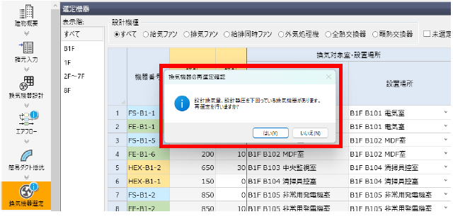 「はい」を選択すると「換気機器の再選定」ダイアログが表示されます。