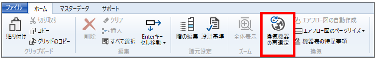 また、ホームメニューの「換気機器の再選定」を押下した場合も、「換気機器の再選定」ダイアログが表示されます。