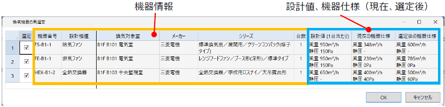 以下換気機器の再選定ダイアログ画面です。