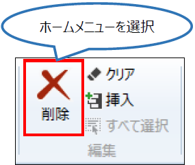 ・削除対象を選択し[ホーム]-[削除]メニューを選択する