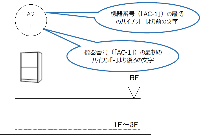 ・作図画面に表示される円記号は系統の新規作成ダイアログで指定した「屋外記番号」で、上側が最初のハイフン「-」より前、下側が最初のハイフン「-」より後ろの文字が表示されます。