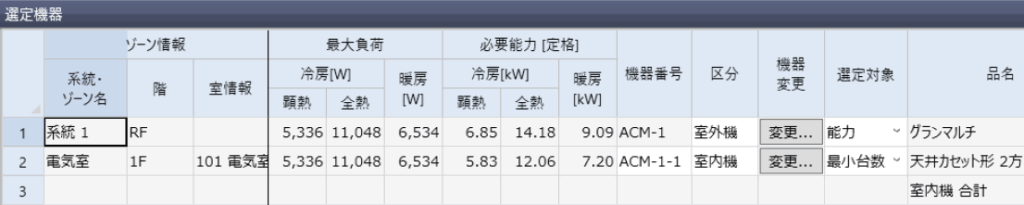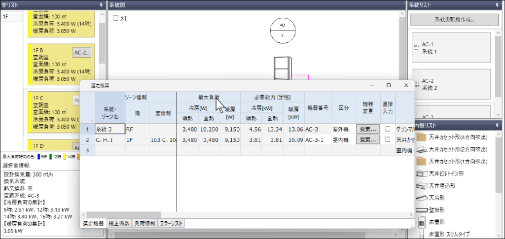 ただし、非空調室として登録された室でも換気機器選定で外気処理エアコンが設置されている場合は室リストに表示されます。