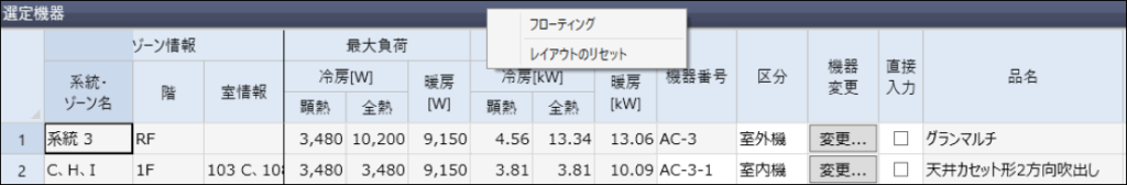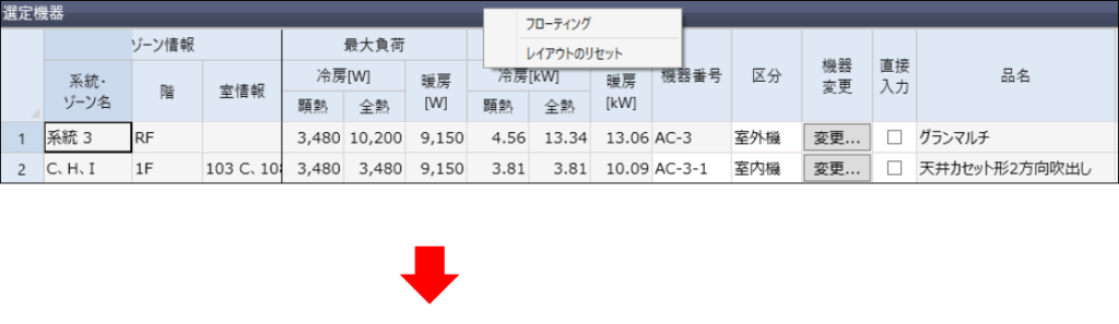 選定機器、補正係数、負荷情報、エラーリストタブのウィンドウタイトルを右クリックし、次のメニューを表示させ、「フローティング」を選択します。