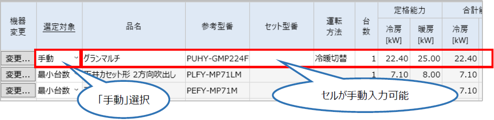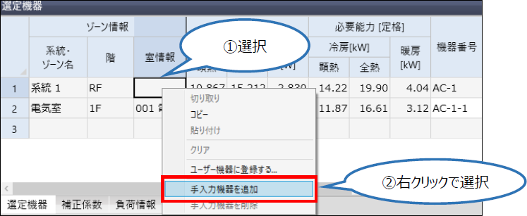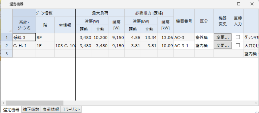 選定機器リストで、「選定機器」「補正係数」「負荷情報」のそれぞれの入力可能な項目の値を入力します。