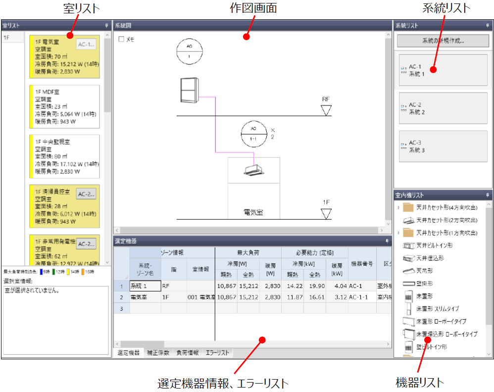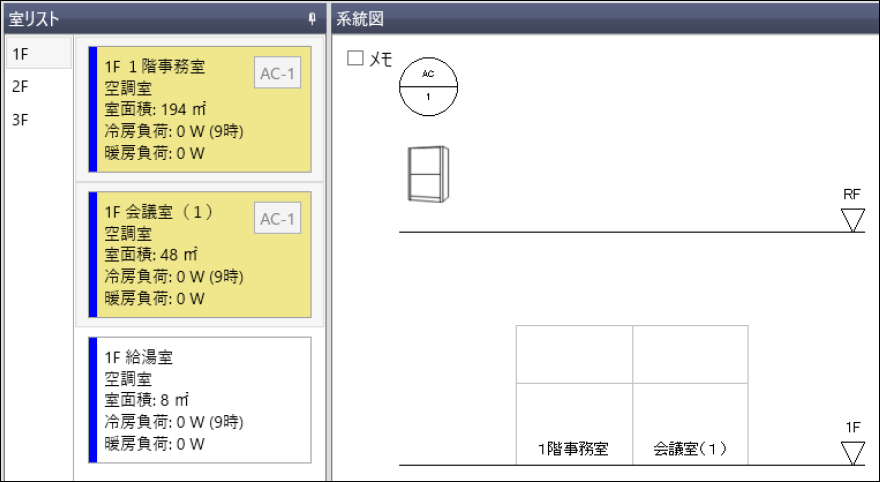・室リストには諸元入力で空調室として登録された室が表示されます。