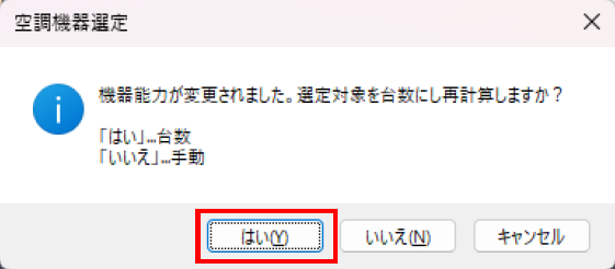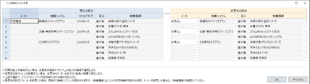 ・変更後の設定でメーカーを変更した場合、同等の「機器システム」が選択されますが、「機器種類」はリストの先頭機器が選択されます。メーカーを変更した場合は、「機器種類」を確認してください。