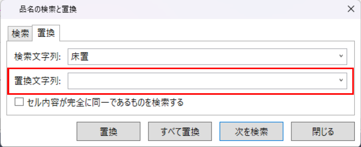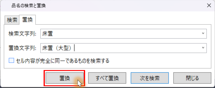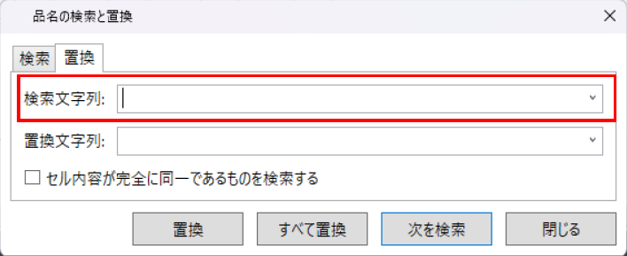 検索画面にて「置換タブ」をマウス左クリックすると…    置換画面に切り替わります。