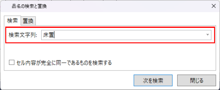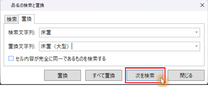 完全に一致する文字を検索する場合は「セル内容が完全に同一であるものを検索する」にチェックを入れてから「次を検索ボタン」をマウス左クリックしてください。
