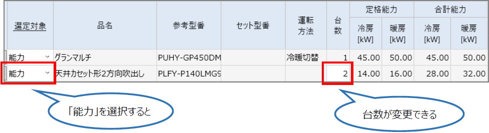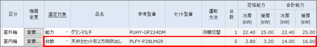 接続容量比が指定範囲に収まるように室外機能力を選定します。