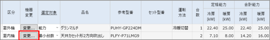 機器の型番、パッケージのセット型番、定格能力の冷房、暖房、接続容量比(マルチ、GHPの室外機のみ)を表示