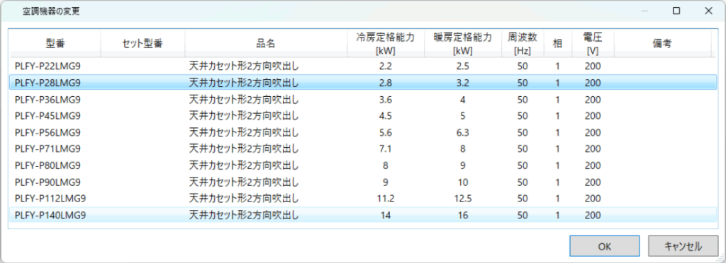 空調タブを選択すると、入力済みの空調機器の付属品を一括で設定することが出来ます。