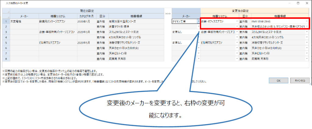 入力済みの空調機器のメーカーを一括で変更できる機能です。