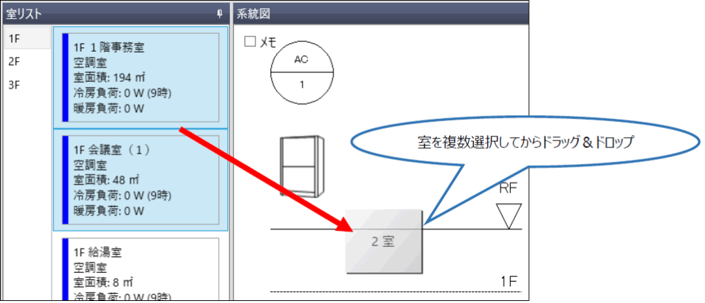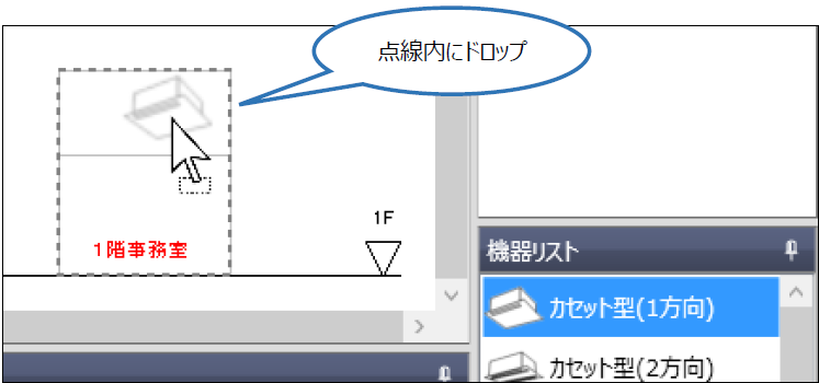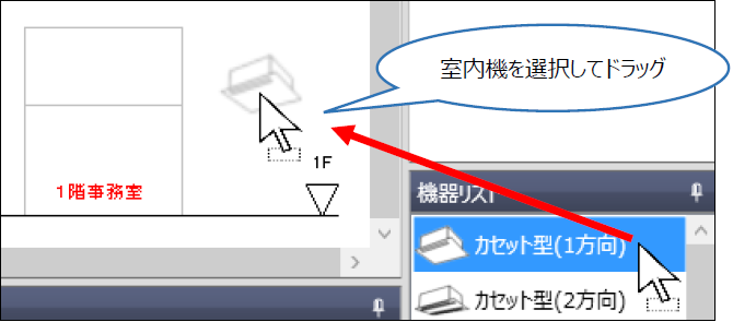 機器リストから室内機を選択し、ドラッグ&ドロップで作図画面に設定します。