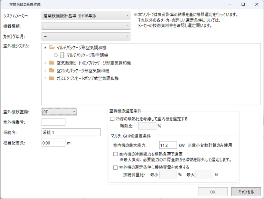 画面に必要事項を確認のうえ入力し、「OK」ボタンを押下すると、指定した室外機番号の系統が作成されます。