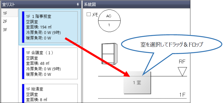 室リストから室を選択し、ドラッグ&ドロップで作図画面に設定します。