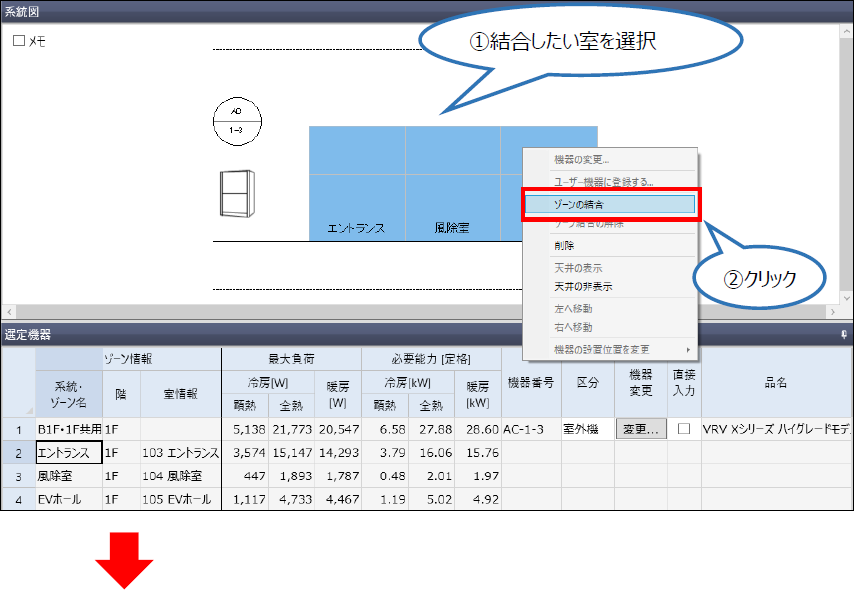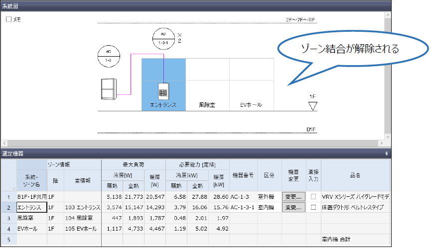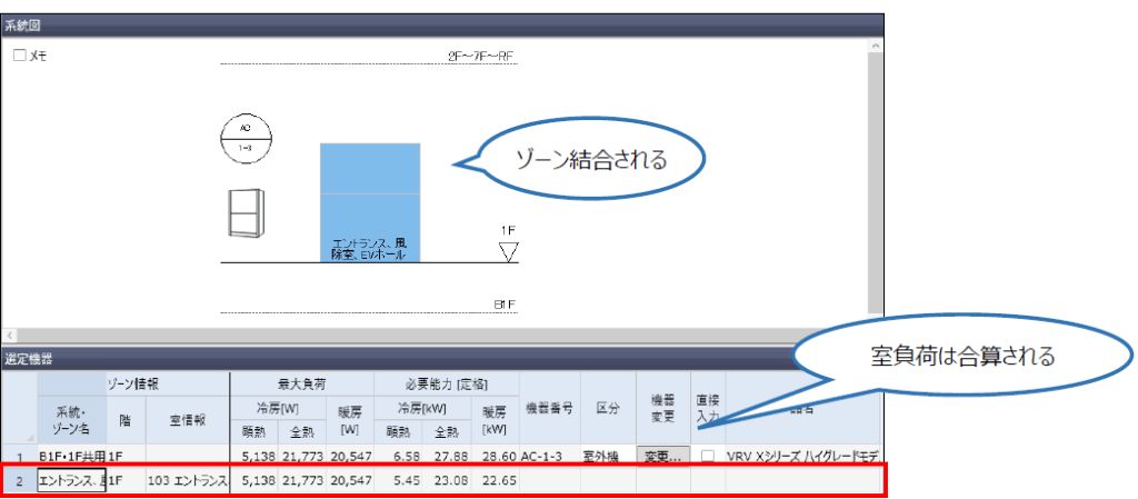 複数室の室負荷を合算したゾーンを作成することで、複数室に対して空調機を選定することが出来ます。