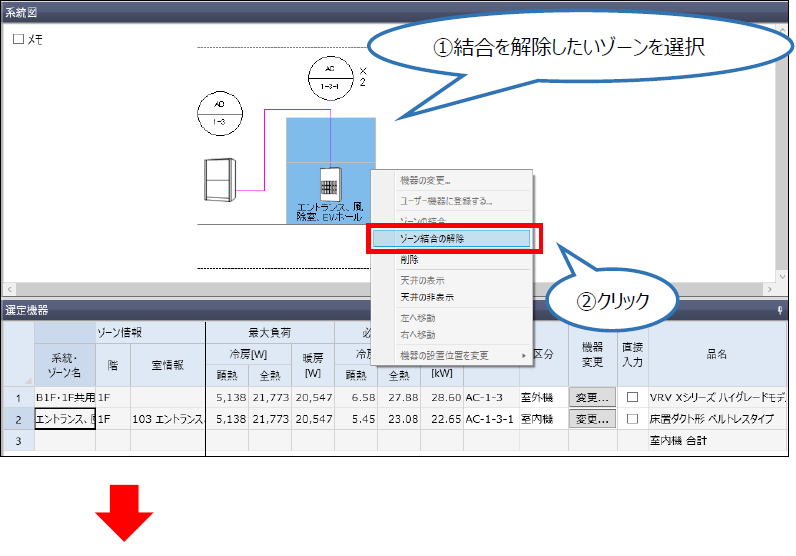 ゾーン結合した空調室の結合を解除することが出来ます。