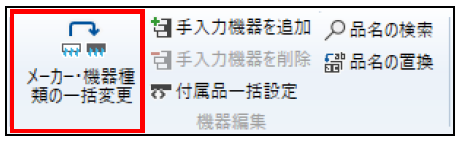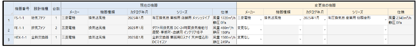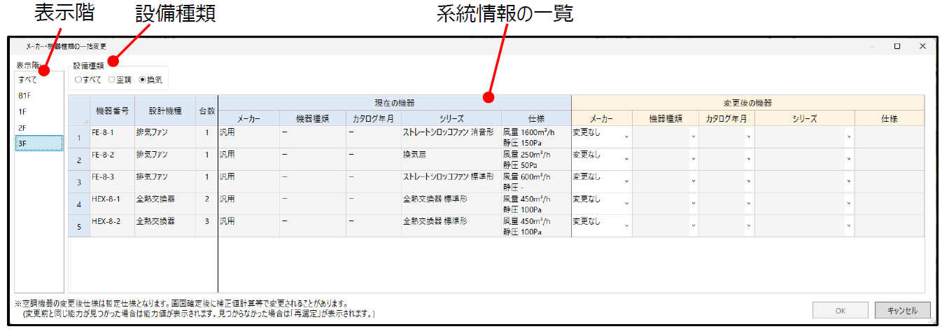 換気機器側の説明については、換気機器選定の「メーカー・機器種類の一括変更 (換気機器)」を参照ください。