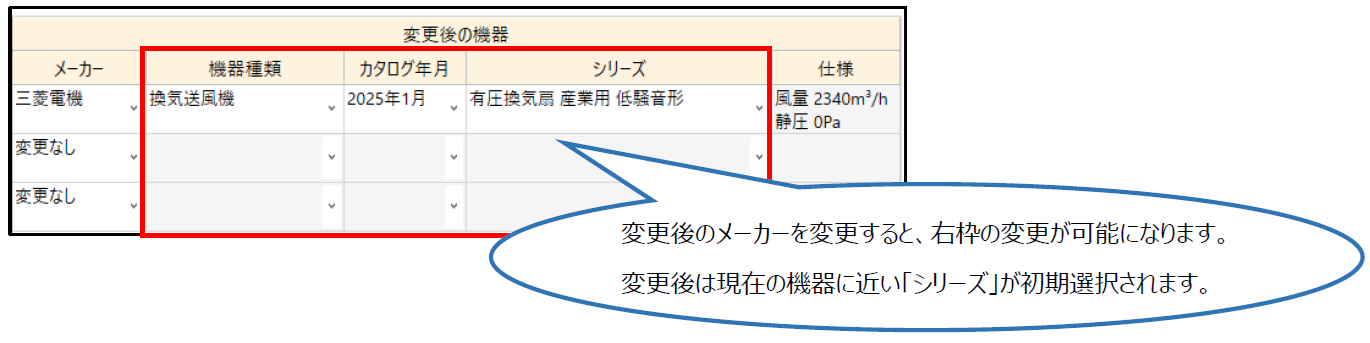メーカーを変更すると、最新のメーカーカタログより現在の機器に近いシリーズが初期選択されます。