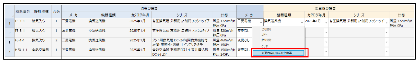 [変更後の機器]の設定内容を他系統に複写することができます。