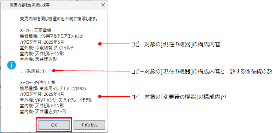 「OK」ボタンを押すとコピー対象の[変更後の機器]の内容が複写対象の[変更後の機器]に反映されます。