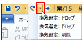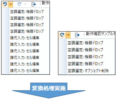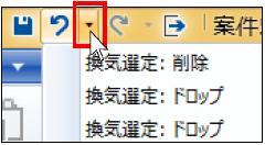 元に戻す・やり直し 《 SeACD2 》 操作マニュアル 目次|元に戻す・やり直し|元に戻すやり直し|元に戻す・やり直し| 元に戻す 直前の操作を元に戻すには、[クイックアクセスツールバー]-[元に戻す]を行います。 ▼印をクリックすると、操作の履歴が一覧で表示され、選択した操作まで戻すことができます。 やり直し 直前の元に戻す操作をやり直すには、[クイックアクセスツールバー]-[やり直し]を行います。 ▼印をクリックすると、操作の履歴が一覧で表示され、選択した操作までやり直すことができます。 注意 【ファイル変換時の注意点】 ファイルメニューの変換処理を行った場合は、操作の履歴をクリアしますのでご注意ください ①変換前の状態:操作の履歴が存在した状態です ②変換後の状態:操作の履歴をクリアします 【SeACD2】目次に戻る