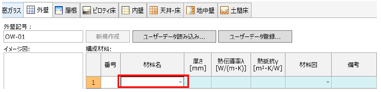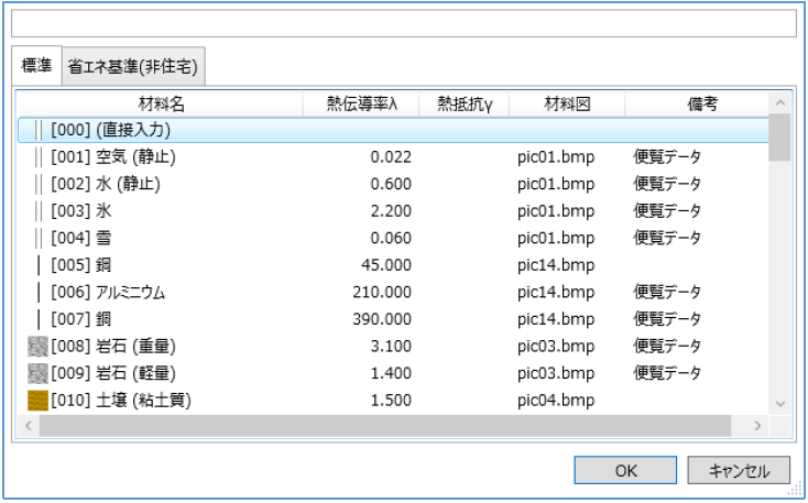 構造体材料リストから 1 つを選択します。選択すると番号、材料名、熱伝導率λ、熱抵抗γ、材料図名が確定します。