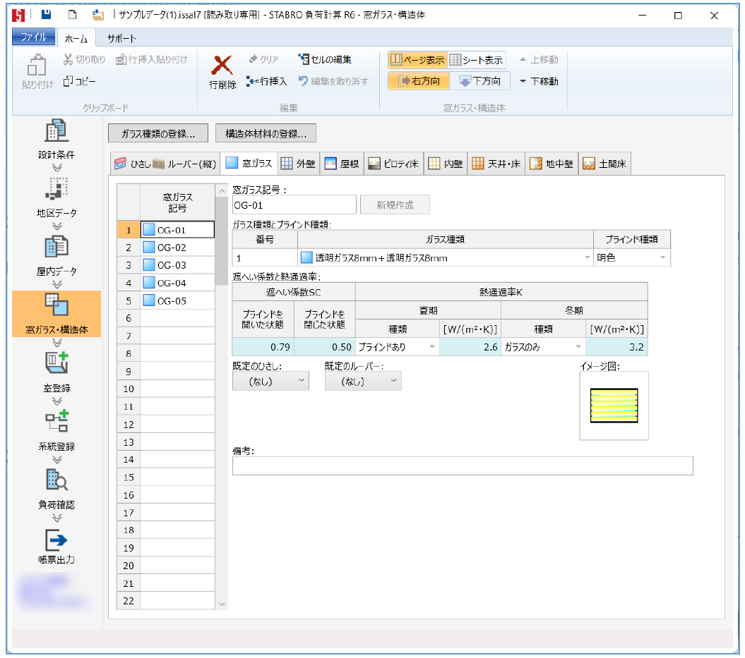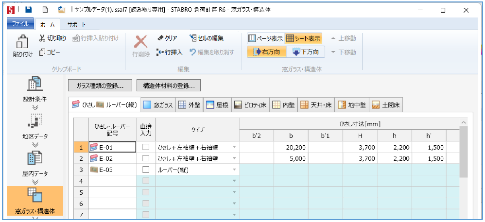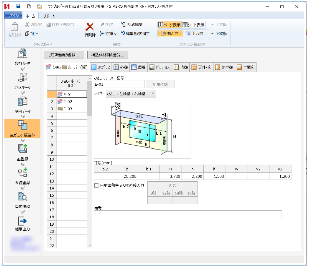 基本的に窓ガラスとひさし・ルーバーは、[室登録]作業ページの[構造体]タブで別々に設定しますが、窓ガラスとひさし・ルーバーがセットの場合、あらかじめここで設定しておくと[室登録]作業ページの[構造体]タブで窓ガラスを入力した際、ひさし・ルーバーも確定され入力が省力化できます。