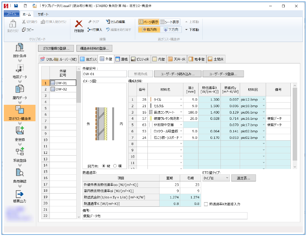 | 熱通過率 K [W/(m²・K)] | 構造体の熱通過率K です。「地中壁」、「土間床」の場合、冬期のみの入力となります。 「熱通過率K を直接入力」をチェックした場合、夏期、冬期別に設定することができ、0~999.9 の範囲が入力可能です。 |